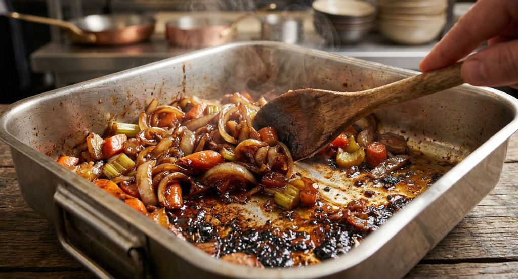 Real gravy starts when the meat comes out of the oven and rests, leaving behind a tray of hot fat and dark, sticky bits. Finely chopped onion, carrot, and celery go straight into that tin and are cooked until caramelised and sweet. Flour is stirred into the fat to make a roux, then loosened with wine or port, followed by hot stock to build body and shine.